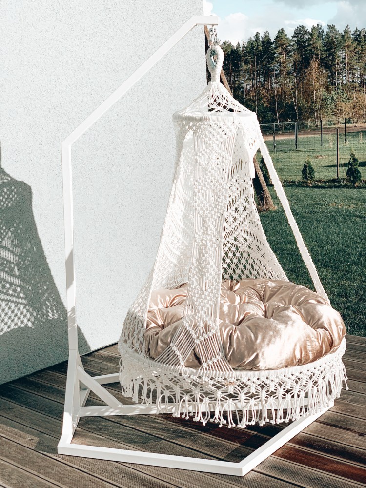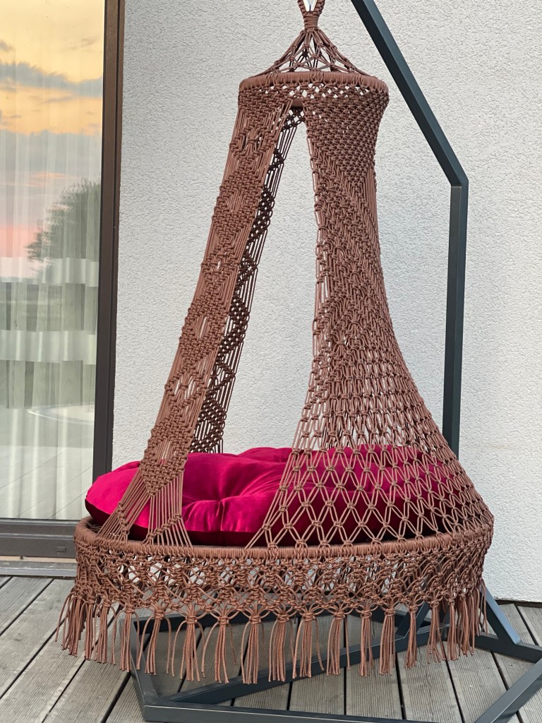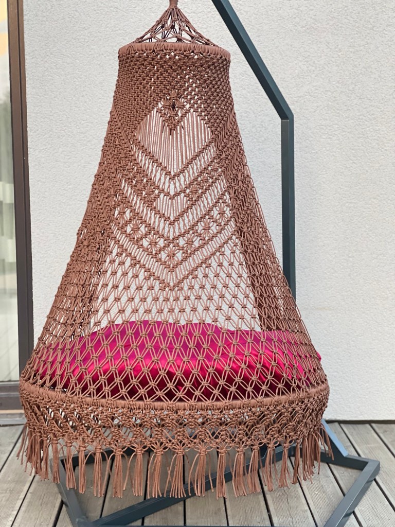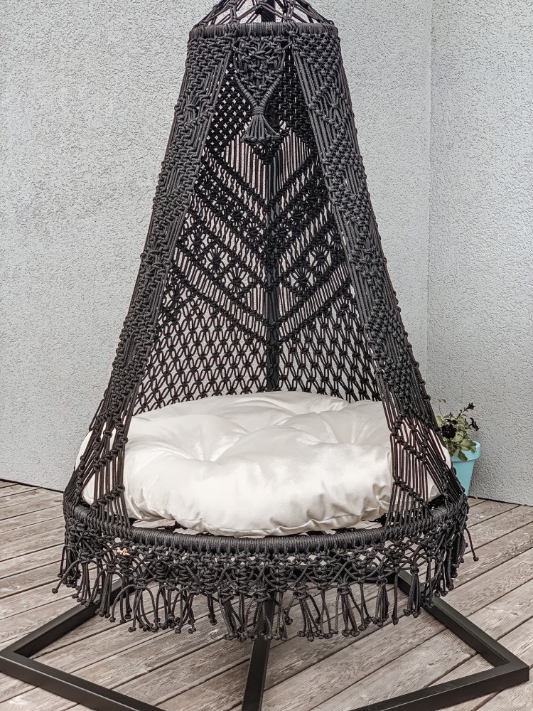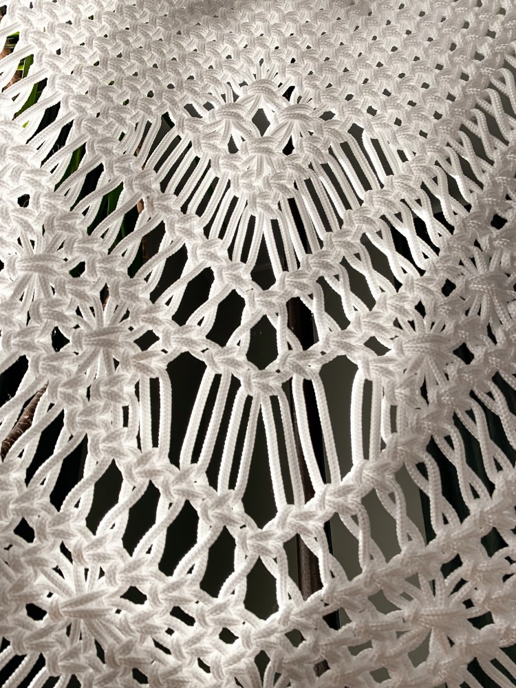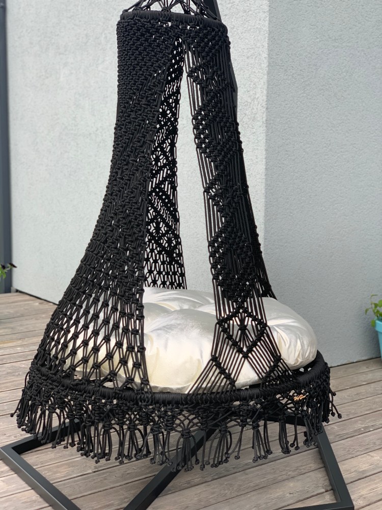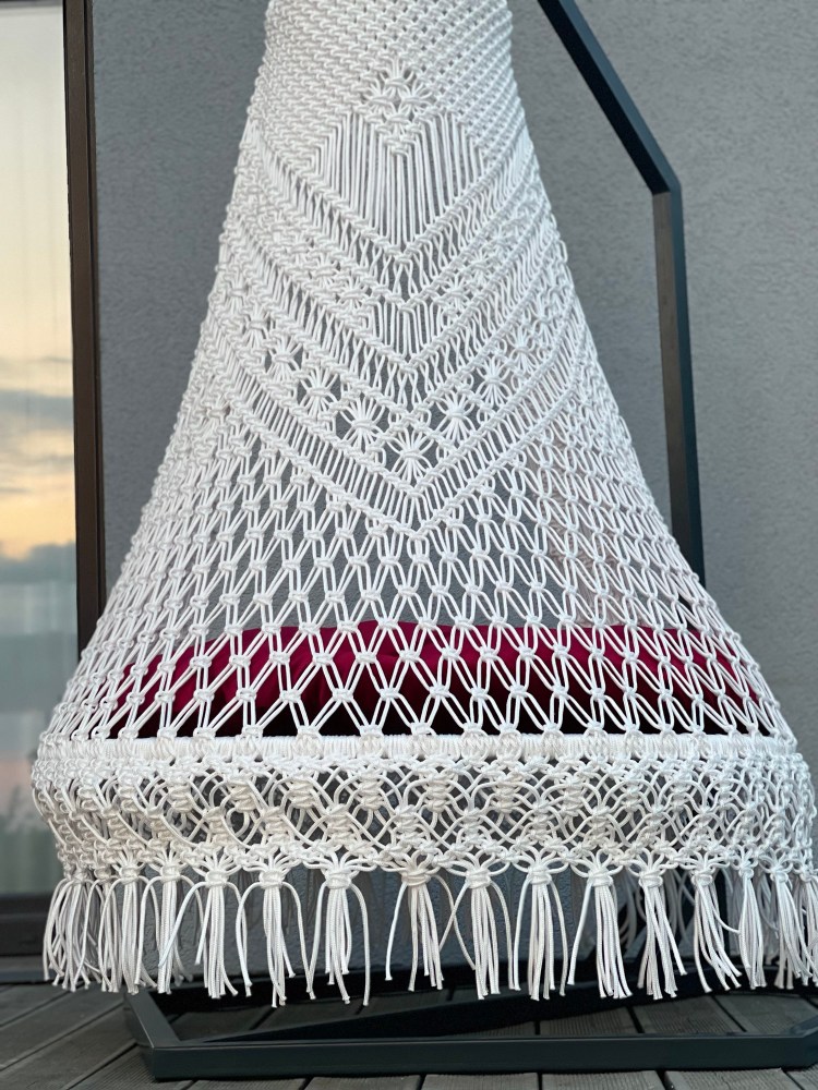 Crafted with the macramé knotting technique, each chair is handmade from moisture-resistant cord, ensuring durability and comfort.