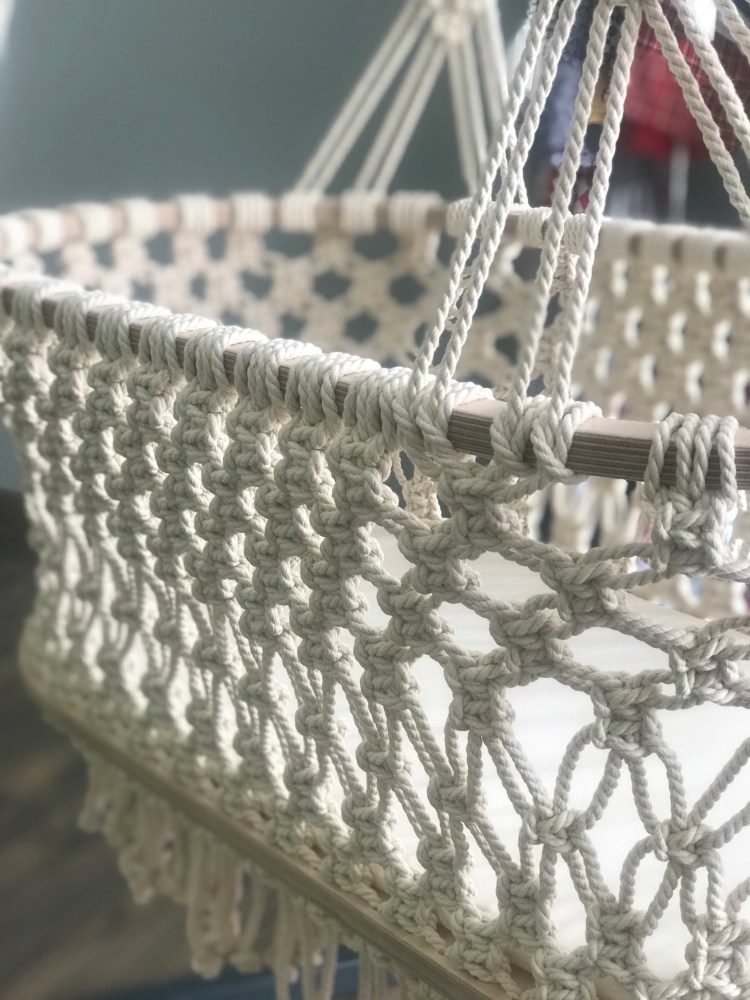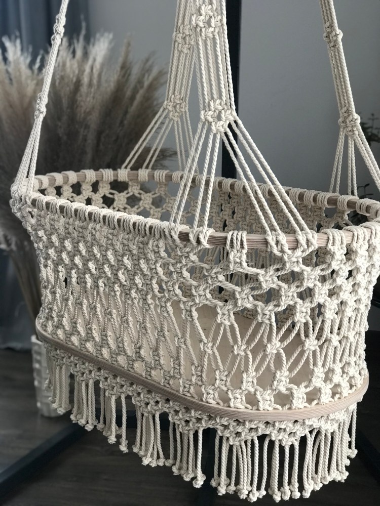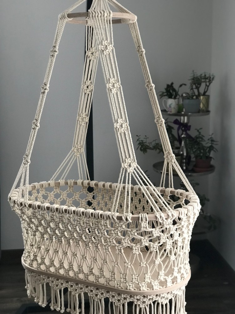 A beautifully handcrafted macramé baby cradle, made with care and attention to every detail.