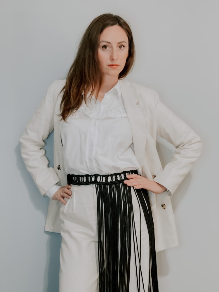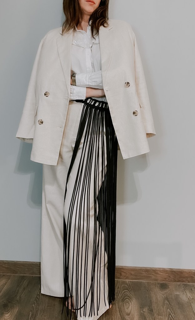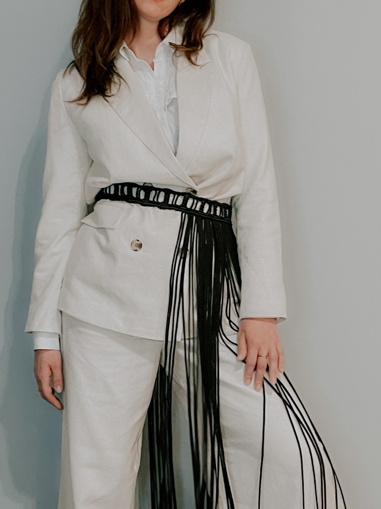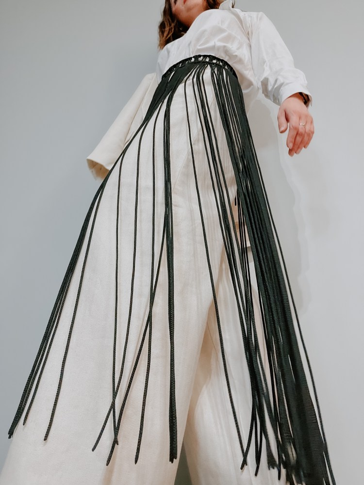 A handmade belt created using the macramé knotting technique, featuring beautiful cascading fringes on one side.