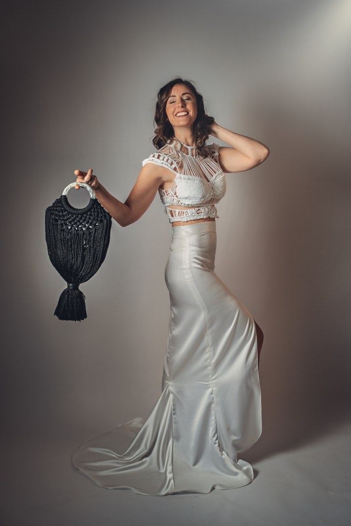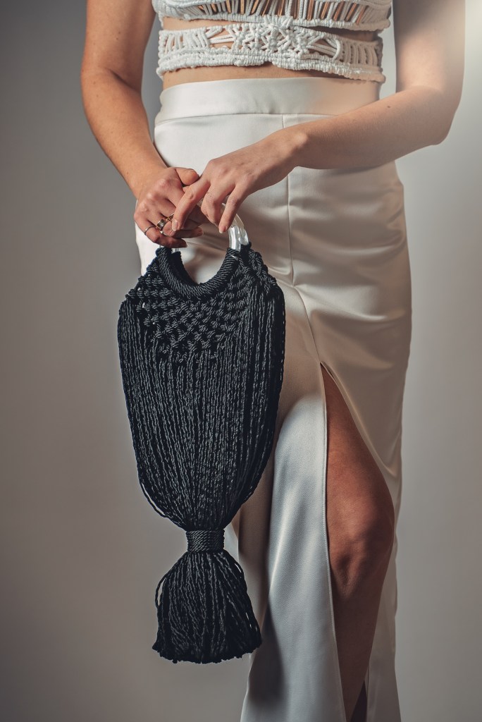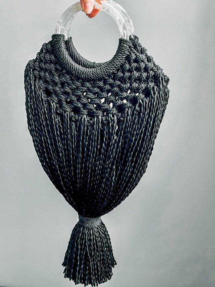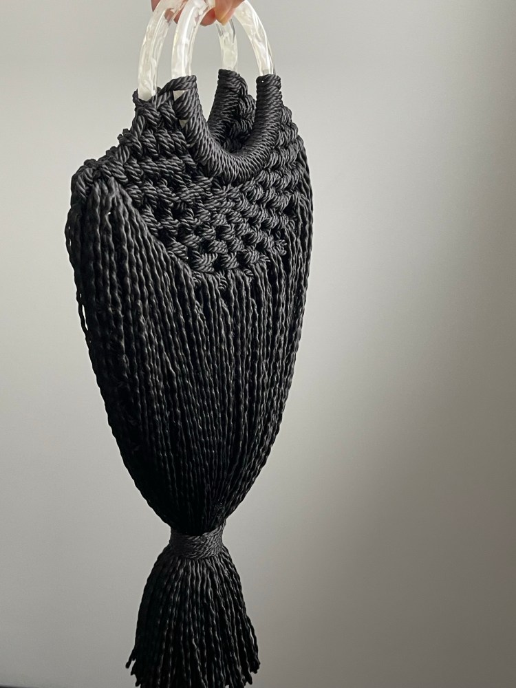 Macramé boho bag with fringes and marble-effect acrylic handles